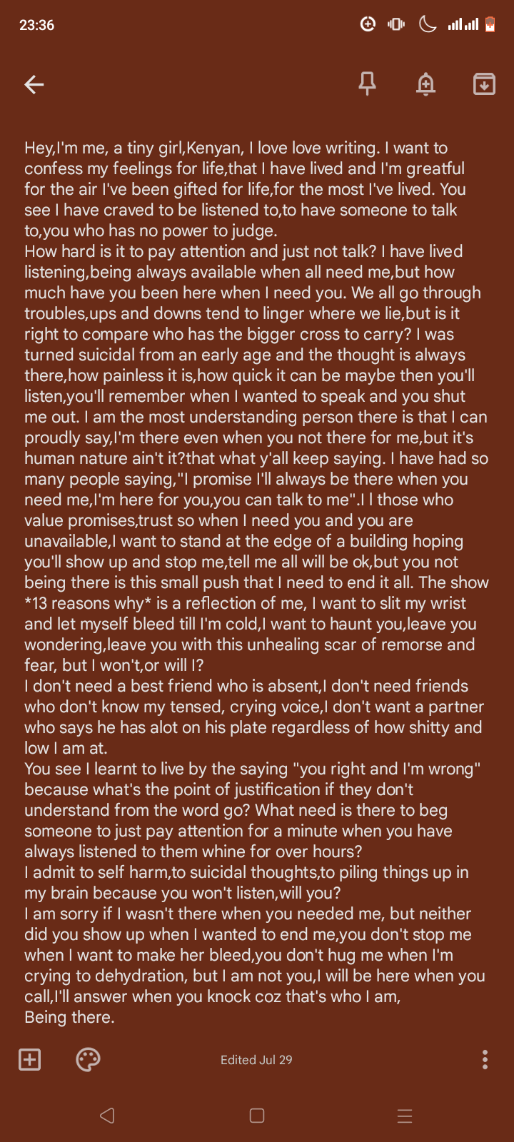 I’m now ready to write Inspired by a broken heart, Words intended to hurt me more I write to express,define and arrange Call me a fool or whatever Maybe I’m wrong to want to be appreciated My feelings getting fermented My head a wormhole in space Feelings floating undetected Im tired trying to catch them Call me a liar Maybe im wrong to express me boldly It’s fine to look at me in disgust Maybe get over your feelings of inadequacy You are wrong to always want to be right Shoving me in the mud whenever You define me to be your junior But in the end you are just insecure